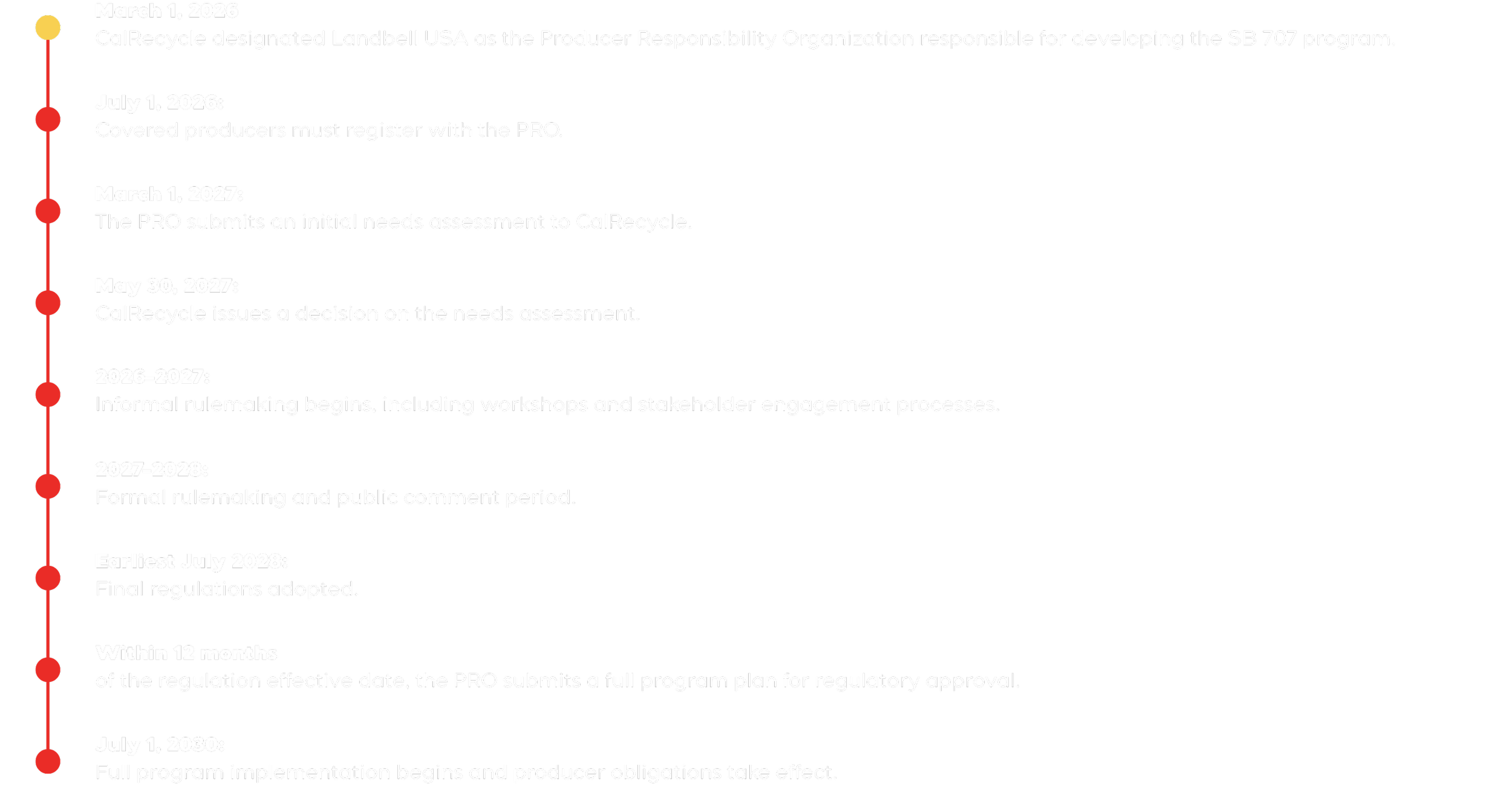 Regulatory deadlines: The next regulatory deadline will be March 1, 2027, when the PRO is required to submit an initial needs assessment to CalRecycle.